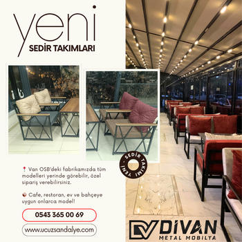 Cafe Masa Sandalye (Van Masa Sandalye İmalat - Van) Divan Metal Mobilya olarak, uzun yıllardır metal mobilya sektöründe kaliteli ve estetik çözümler sunuyoruz. Düğün salonları, toplantı salonları, oteller, restoranlar, kafeler, ofisler ve evler için dayanıklı ve şık sandalye, masa ve oturma grupları üretiyoruz. Van Divan Metal Mobilya Van Masa Sandalye Fabrikası Adres Şemsibey OSB, 2. Sokak No12, 65030 Tuşba VAN ucuzsandalye.com vansandalye