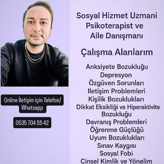 Sosyal Hizmet Uzmanı Aile Danışmanı Psikoterapist Çocuk Gelişimcisi 12 Yıl Aile ve Sosyal Hizmetler Bakanlığında Tecrübe 5 yıl Online Terapide tecrübeliyim