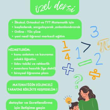 Ben Ecenur YILDIZ, Matematik Öğretmeniyim. Son iki yıldır özel ders veriyorum referanslarım mevcut, aynı zamanda geçen yıl mart-haziran döneminde DERSDEM derneği bünyesinde gönüllü online ders hizmeti sundum ve bu süreci başarıyla tamamladığıma dair sertifikam mevcut. Matematiğin doğru şekilde öğretildiğinde her çocuk tarafından anlaşılabileceğine inanıyorum. Bu nedenle öğrencilerimin matematiği keşfederek, sorgulayarak, anlamlandırarak öğrenmelerini sağlamayı hedefliyorum. Öğrenci merkezli yaparak ve yaşayarak öğrenme metoduyla ilkokul ve ortaokul seviyelerine birebir özel ders vermekteyim. özel ders hizmetlerim: konu anlatımı ve kavrama odaklı öğretim, ödev takibi ve rehberlik, sınavlara hazırlık ( lgs dahil), soru çözümü ve problem odaklı çalışmalar, Öğrencinin ihtiyacına uygun bireysel öğrenme planı. matematiği sağlam bir temel üstüne birlikte inşa edelim!