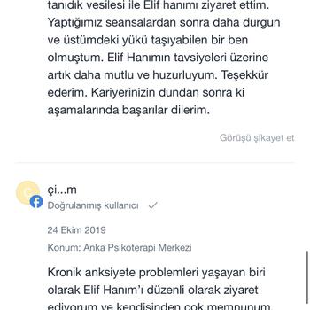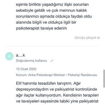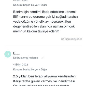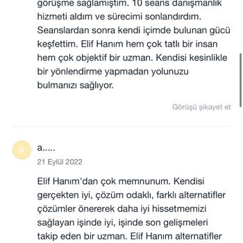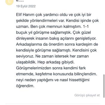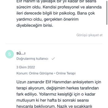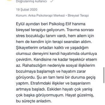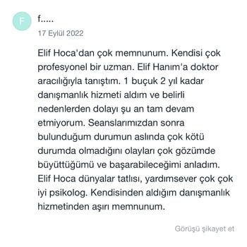 Lisans ve yüksek lisans mezunu uzman psikoloğum. Bursa Nilüfer'de kendi kliniğim olan Anka Psikoterapi'de online ve yüz yüze bireysel psikoterapi hizmeti veriyorum. Alandaki gelişmeleri düzenli olarak takip ediyor ve başta gizlilik olmak üzere tüm etik kurallara dikkat ediyorum. Danışanlarımla içten ve sıcak bir ilişki kurmaya özen gösterirken sınırlarına ve özel alanlarına saygı duyuyorum. Sizinle ve sorunlarınızla titizlikle ilgileneceğime emin olabilirsiniz💫 Website: www.elifterzikoy.com Youtube: elifterzikoy Instagram: ankapsikoterapi Seans ücretlerim armut uygulamasına indirimlidir. Danışan yorumlarımı incelemek isterseniz Doktor Takvimi uygulamasına bakabilir ya da internet üzerinden adım soyadımla aratabilirsiniz.