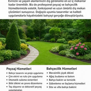 Evinizin ve yaşam alanlarınızın dış görünümü en az iç mekanlar kadar önemlidir Biz de profesyonel peyzaj ve bahçecilik hizmetlerimizle estetik fonksiyonel ve uzun ömürlü dış mekan çözümleri sunuyoruz Doğayla uyumlu tasarımlar ve kaliteli uygulamalarla hayalinizdeki bahçeyi gerçeğe dönüştürüyoruz Peyzaj Hizmetleri Bahçe tasarımı ve proje uygulama Çim ekimi ve rulo çim uygulama Otomatik sulama sistemleri Bitki dikimi ve çevre düzenleme Taş döşeme ve dekoratif peyzaj uygulamaları Bahçecilik Hizmetleri Mevsimlik çiçek dikimi Ağaç budama ve bakım Bahçe bakım ve temizlik Gübreleme ve ilaçlama hizmetleri Site ve villa bahçe bakımı Her projeye titizlikle yaklaşarak estetik ve sürdürülebilir çözümler sunuyoruz Alanınıza değer katan doğal ve şık tasarımlar için profesyonel ekibimizle hizmetinizdeyiz Zamanında teslim Kaliteli malzeme ve bitki seçimi Uygun fiyat garantisi Ücretsiz keşif hizmeti Müşteri memnuniyeti odaklı çalışma Yaşam alanlarınıza doğanın huzurunu katmak için bizimle iletişime geçin Ücretsiz keşif fırsatından hemen yararlanın