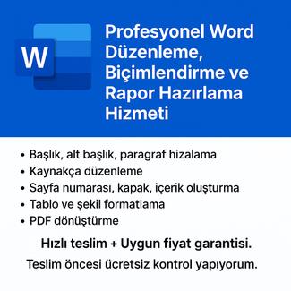 Merhaba, Word düzenleme yapıyorum. Biçimlendirme + tablo + numaralandırma + rapor düzeni sağlayabilirim. Referans isterseniz örnek atarım.