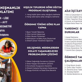 25 yıldır ÖĞRETMENLİK hayatımda MATEMATİK dalında Derece ve Olimpiyat öğrencileri ile beraber çalışmaktayım. İşim sadece ders anlatmak değil aşağıda bahsettiğim etkinliklerle öğrencinin nasıl daha iyi öğrenebileceğini kısacası öğrenmeyi öğrenme metodu ile etkin ve verimli bir çalışma yapıyoruz. Her öğrenciye göre planlanmış özel programlarla , hafızayı kuvvetlendirme zihinsel becerileri arttırma, mizaca göre öğretim metodu ve uygulanabilir takip sistemi ile öğrenmenin kalıcı hale getiriyorum. 1 Kişilik ve Zeka tiplerine göre öğrenme modeli 2 Beyin Temelli öğrenme uygulamaları 3 Zihni nasıl ne zaman daha verimli kullanabilirim? 4 Etkin okuma yöntemleri 5 Motivasyonu arttırma yolları 6 Efektif zaman yönetimi 7 Dikkat dağınıklığı sorunlarının çözümü 8 Sınav kaysı sorunlarının çözümü 9 Öz disiplin ve öz denetim duygusunu kazanma 10 Duygu kontrolü ve ifade etme becerisi 11 Çocuk ve ergenlerle etkili iletişim 12 Ödev yapılırken yapılan iletişim kazaları 13 Öğrenci tanıma analizleri ve çalışmaları 14 Aile içi iletişim kazalarının çözümü