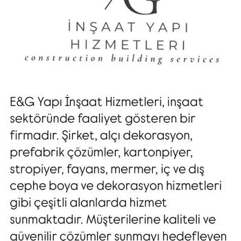 E&G Yapı İnşaat Hizmetleri, inşaat sektöründe faaliyet gösteren bir firmadır. Şirket, alçı dekorasyon, prefabrik çözümler, kartonpiyer, stropiyer, fayans, mermer, iç ve dış cephe boya ve dekorasyon hizmetleri gibi çeşitli alanlarda hizmet sunmaktadır. Müşterilerine kaliteli ve güvenilir çözümler sunmayı hedefleyen E&G Yapı, projelerinde modern teknikler ve malzemeler kullanarak müşteri memnuniyetini ön planda tutmaktadır.