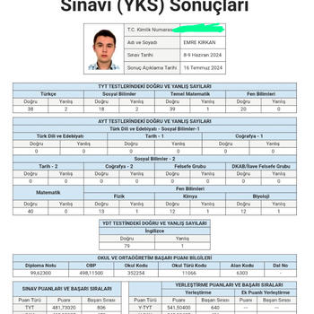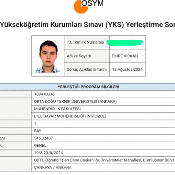 Emre Kırkan. Yks 2024 sınavında sayısal 406.sı olarak ODTÜ Bilgisayar Mühendisliğine yerleştim. Birinci sınıf öğrencisiyim. Sayısal alanda hedefleri olan öğrencilere online olarak koçluk yapabilirim.Vize ve Final haftası ders verilemeyecektir. Not: Arayacağınız numarada menajerim bulunmaktadır, onunla iletişime geçebilirsiniz.