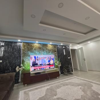 Tv unite arkasi lambiri duvara kaplama ve mermer desenli pvc uygulama. Ev dekorasyonunuz icin iletisime gecin.