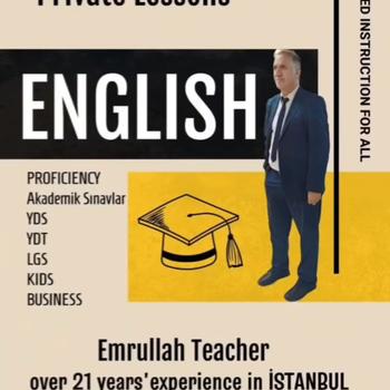 Merhabalar; Ben Emrullah Hoca . 22 yıldır İngilizce öğretmeniyim. İstanbul'da Kolej ve Bakırköy Amerikan kültür dil okullarında,İngiliz kültür dil okullarında çalıştım. Her seviyede (IELTS,TOEFL,YDS,YDT,LGS, BUSINESS ENGLISH,KIDS.) dersler veriyorum. İki yıldır MANİSA-TURGUTLU 'dayım. Bir yıl kolejde çalıştım. Şu anda özel kursda LGS dersleri veriyorum ve yoğunlukta Birebir ve Grup özel derslerime devam ediyorum. tavsiye ettiğim kitaplarla birlikte seviyeye göre konu anlatımı, pratik çözüm yolları, kelime çalışmaları öğrenciyi sıkmadan farklı aktivitelerle çalışmalarımı verimli bir şekilde yürütüyorum. okul derslerine yardımcı olacak ve okul sınavlarına hazırlık da yapıyorum . Home Ofis olarak büyük ekran televizyona laptoptan yansıtarak ekran kalemi ile Derslerimi yapıyorum.Gerekirse öğrencinin evinde de yapılabilir. Referansım öğrencilerimdir. Başarı odaklı çalışmayı severim. Sizinle de tabii ki tecrübemi paylaşmak isterim. Ayrıntılı telefonla veya yüzyüze görüşebiliriz. İyi çalışmalar İnstagram hesabım: @turgutlu_ingilizceozel