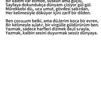 Ben M. Ensar Karaca, 12 yaşındayım ve 6. sınıf öğrencisiyim. Yazı yazma konusunda yetenekliyim ve bu alanda kendimi sürekli geliştiriyorum. Yaratıcı düşünme becerimle çeşitli konularda özgün ve dikkat çekici metinler oluşturabiliyorum. Özellikle hikâye, kısa yazı ve tanıtım metinleri yazmak en güçlü yönlerim arasında. Disiplinli, öğrenmeye açık ve çalışkan biriyim. Yazarlıkla ilgili görevlerde yer almaktan mutluluk duyarım.