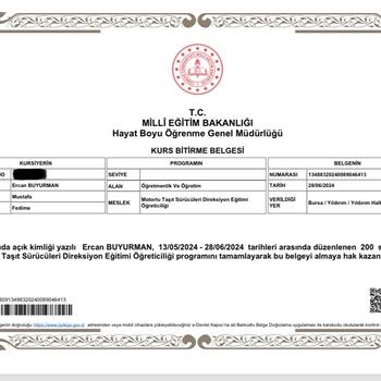 Merhaba, ben Ercan, 20 yıldır aktif araç kullanıcısı olarak aynı zamanda Halk Eğitim Merkezinde verilen 200 saatlik DİREKSİYON USTA ÖĞRETİCİSİ EĞİTİMİ’ni başarı ile tamamlamış bir eğitici olarak siz değerli kursiyerlerime profesyonel destek vermeyi amaçlıyorum. Faydalı olmam dileğiyle…