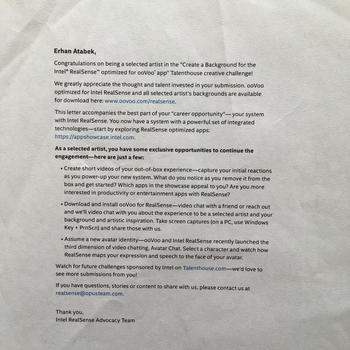 Yarı iletken üreticisi teknoloji devi Intel® kendi geliştirdiği uygulaması RealSense™ için optimize edilmiş olan ooVoo aplikasyonu için sanal arkaplan çalışmasına seçilen 4 uluslararası tasarımdan biri.