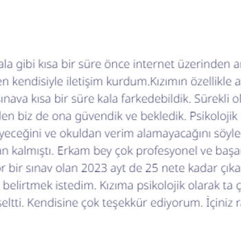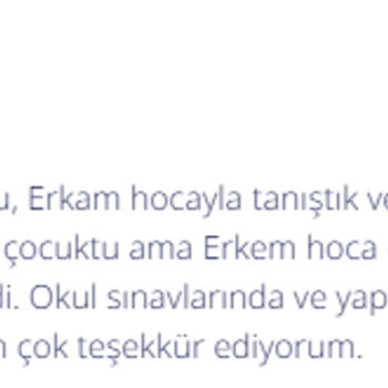 Merhabalar ben Erkam Hoca, Uzun süreden beri(11 sene) kesintisiz olarak özel dersler ile öğrencilerimi matematik alanında hedeflerine ulaşmalarında yardımcı oluyorum. 11 yıldır gözde üniversitelerin tıp, hukuk, mühendislik bölümlerine kazandırdığım onlarca öğrencim oldu. Daha öncesinde TYT, AYT, LGS, DGS, ALES, KPSS sınavlarına hazırladığım birçok öğrencim oldu. Ayrıca geçmişte birkaç tane kurumsal dershanede öğretmenlik deneyimi.. Hazırlığında yardımcı olduğum bazı uluslararası müfredat ve sınavlar aşağıdaki gibidir. YÖS(Yabancı Uyruklu Öğrenci Sınavı) IB SL/HL(International Baccalaureate) Cambridge IGCSE( Uluslararası İngiliz Lise Müfredatı) SAT(Scholastic Aptitude Test) GMAT(Graduate Management Admission Test) AP Calculus AB/BC Hazırlığında yardımcı olduğum bazı üniversite dersleri aşağıdaki gibidir. İstatistik ve Olasılık Dersleri Analiz 1-2(Calculus 1-2) Üniversitelerin farklı bölümlerinin Matematik 1-2 dersleri Lineer Cebir Kompleks Analiz Diferansiyel Denklemler Sayısal Analiz Bu dersleri İngilizce de işleyebiliyoruz. Şuan yalnızca özel dersler veriyorum çünkü özel ders öğrencilerimi daha fazla takip edebilip daha hızlı sonuca ulaştırabilmek adına. Derslerimi zoom programı üzerinden 55 dakika olarak işliyorum ve sadece ONLİNE olarak ders veriyorum. Genel olarak ders işleyiş tarzımdan bahsedeyim. Öncelikle öğrencimin seviyesini tespit edip ona göre öğrenciyle karşılıklı konuşarak haftalık ders programı oluşturuyoruz. Sonrasında öğrenciyle derse başlayıp hangi öğrenme metodunun öğrenci için ideal olduğunu tespit edip o teknik ile ilerliyoruz. Sormak istediğiniz herhangi bir konu olursa aramaktan ya da mesaj atmaktan çekinmeyiniz lütfen.