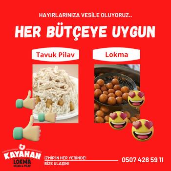 Kayahan lokma olarak Merhabalar bizi tercih ettiğiniz için teşekkür ederiz, Lokma için ⬇️ Tavuklu pilav ayran için ⬇️ ✅İzmir içi her yere geliyoruz. ✅Tabak garantisi veriyoruz. ✅Dilediğiniz lokasyonda hayrınızı gerçekleştiriyoruz. ✅Araçlarımız da ki ses sistemi ile yasin veya ilahi eşliğinde hayırlarınıza vesile oluyoruz.