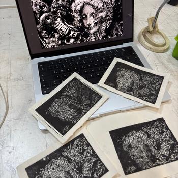 Metal garvür ve yüksek baskı gibi teknikleri kullanarak sanatımı çoğaltıyorum. Yaptığım dijital çizimleri grafik tasarımla birleştirdiğim bu yolda bana eşlik etmek ister misiniz
