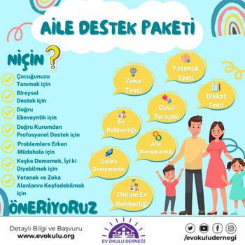 Ev Okulu Derneği, aile ve çocukların gelişim sürecinde profesyonel destek veren Türkiye'nin önde gelen STK'sıdır. Dernek kurucusu ve başkanı aynı zamanda MEB Beşiktaş RAM Müdürü Uzman Psikolojik Danışman Mehmet Hilmi EREN'dir. Zeka Testi, Yetenek Testi, Aile Danışmanlığı, Çocuklar ve Aileler İçin kendi evinin konforunda verilen EV REHBERLİĞİ / Mentörlük Programı, Dikkat Testi, Oyun Terapisi, Terapi ve Danışmanlık hizmetleriyle ön plana çıkmaktadır. Yetişkinlere yönelik verilen terapi destekleriyle de hizmetini sürdürmektedir. Detaylı bilgi için evokulu org websitesi ve evokuludernegi sosyal medya hesapları incelenebilir.