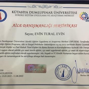 Merhaba ben Evin Tural, sosyal hizmet bölümünden mezun olduktan sonra Dumlupınar Üniversitesi Aile Danışmanlığı eğitimine başlayıp başarıyla tamamladım. Aynı zamanda Almanya Merkezli World Association for Positive and Transcultural Psychotherapy (WAPP)'tan pozitif psikoterapi temel düzey eğitimimi tamamladım ve pozitif psikoterapi temel danışmanı unvanımı aldım. Şu an pozitif psikoterapi alanında master eğitimime devam etmekteyim. Lisans eğitimim ve aile danışmanlığı eğitimim süresince 5 yıl anaokullarında çocuklar ile çalışabilme fırsatım oldu. 5 yıllık çalışmalarımın mesleğime olan katkısı benim için çok büyük ve çok değerli.Şu an yetişkinler, çocuklar ve aileler ile çalışmaktayım.