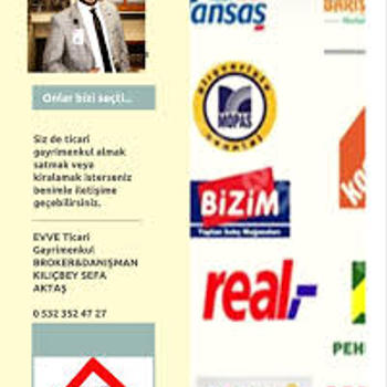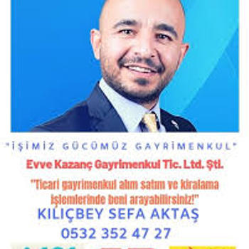 • 15 yıllık ticari ve konut gayrimenkul deneyimi ile • EVVE TİCARİ GAYRİMENKUL A.Ş • TİCARİ UZMAN İŞ ORTAKLARI ile • ANKARA'DA • Konut,Ticari ve endüstriyel mülklerinizin kiralanması ve satışı için hizmet veriyor. HİZMET VERDİĞİMİZ ALAN:TÜM TÜRKİYE UZMANLIK BÖLGEMİZ:ANKARA •YENİMAHALLE,ÇANKAYA, SİNCAN,ETİMESGUT,ALTINDAĞ, MAMAK,KAZAN,ELMADAĞ, POLATLI,BEYPAZARI, KIZILCAHAMAM • UZMANLIK KONUMUZ:Kurumsal kiracılı dükkan,ofis katları, plaza katları ve müstakil ofis binaları, ticaret arsaları konut projeleri. 15 YILDA NE YAPTIK • 10.000'den fazla portföy ekspertizi • 4.000'den fazla portföy pazarlaması • 2000'den fazla satış işlemi • 1300'den fazla kira sözleşmesine aracılık • 80.000'den fazla görüşme • 25.000'den fazla alıcı satıcı kaydı GÜCÜMÜZ DENEYİMİMİZDEN GELİYOR. KILIÇBEY SEFA AKTAŞ TİCARİ GAYRİMENKUL BROKER