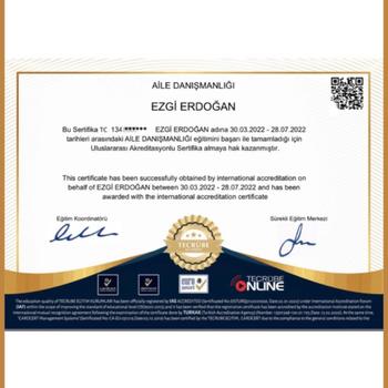 Merhabalar, ben Uzm. Aile ve Evlilik Danışmanı Ezgi ERDOĞAN. İstanbul Üniversitesi Sosyoloji Lisans bölümü mezunuyum.MEB onaylı Aile ve Evlilik Danışmanlığı alanında eğitimimi tamamladım. Uzmanlık alanlarım ve çalıştığım konular şunlardır; Bireysel Danışmanlık, Aile Danışmanlığı, Çift Terapisi, Evlilik Öncesi Danışmanlık, Çocuk ve Ergen Danışmanlığı Alanında Hizmet vermekteyim. Yetkinlikler: Aile Değerlendirme Ölçeği, Çözüm Odaklı Terapi, Kriz, Travma ve Yas Danışmanlığı, Yetişkinlerde İlk Görüşme Teknikleri, Oyun Terapisi, Yaşam Koçluğu, Öğretici-Eğitim Koçluğu anlanlarında eğitim aldım belgelerim bulunmaktadır.