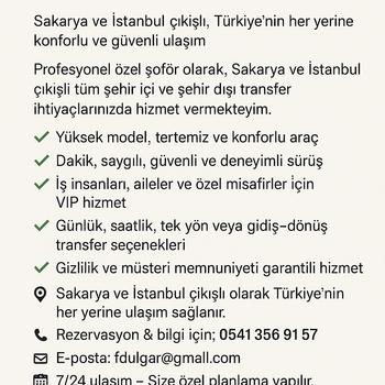 Özel Şoför VIP Transfer Hizmeti Sakarya ve İstanbul çıkışlı Türkiye nin her yerine konforlu ve güvenli ulaşım Profesyonel özel şoför olarak Sakarya ve İstanbul çıkışlı tüm şehir içi ve şehir dışı transfer ihtiyaçlarınızda hizmet vermekteyim. Yüksek model tertemiz ve konforlu araç Dakik saygılı güvenli ve deneyimli sürüş İş insanları aileler ve özel misafirler için VIP hizmet Günlük saatlik tek yön veya gidiş dönüş transfer seçenekleri Gizlilik ve müşteri memnuniyeti garantili hizmet. Sakarya ve İstanbul çıkışlı olarak Türkiye nin her yerine ulaşım sağlanır. Rezervasyon ve bilgi için fotoğraftaki iletişim numarası üzerinden ulaşabilirsiniz.