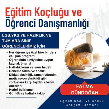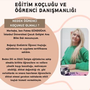 İstanbul Üniversitesi Çocuk Gelişimi bölümü'nden mezun oldum. Boğaziçi Enstitüsü'nden öğrenci koçluğu sertifikasına sahibim. On yıldır öğrenci koçluğu, Eğitim Danışmanı, Genel Koordinatörlük çalışmaları yapmakta ve kendimi geliştirmekteyim. Beden Dili ve Etkili iletişime sahip olmakla birlikte öğrencilere ve velilere yönelik kaygı bozukluğu, motivasyon eksikliği , dikkat dağınıklığı gibi vb. zorluklarda ve sınava hazırlanan öğrencilerin dikkat etmesi gereken noktalarda etkili Koçluk hizmeti vermekteyim .