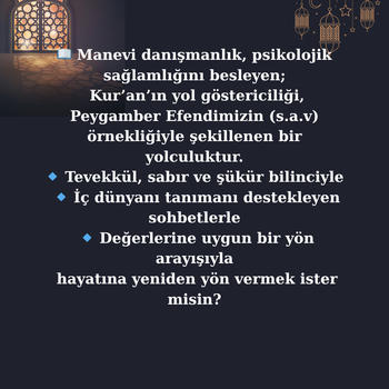 Manevi değerler ışığında kendini tanıma,potansiyelini farketme,değerini anlama.Kur'an perspektifinde Furkan farkındalığına ulaşma yolculuğu. Beraber çıkacağımız bu kıymetli yolculukta size unuttuğumuz,farkına varmadığımız içimizde var olan istidatları keşfetme de rehberlik ediyor olacağım.Ben neden başaramıyorum,irademi kullanmakta neden zorlanıyorum,hep bu şekilde mi devam edecek,bir türlü kendimi değiştiremiyorum, dediğimiz her nokta da Kur'an'ın ışığında çözümler buluyor olacağız.