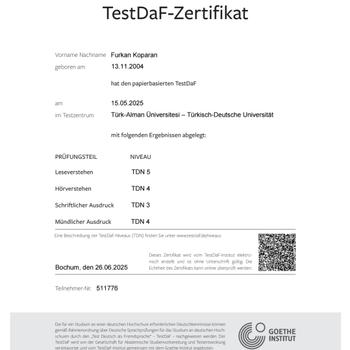 Pema Fen Lisesi 2022 mezunuyum. Türk Alman Üniversitesi Makina Mühendisliği öğrencisiyim. Testdaf 16 notum ile B2-C1 belgesine sahibim. Almancaya ek olarak akıcı İngilizce konuşabiliyorum. Almanca öğrenmenizde ve özellikle sınav odaklı çalışmalarınızda yardımcı olmayı çok isterim. Benim ilk özel ders tecrübem ancak sınıf arkadaşlarıma çokça yardımcı oldum. Önümüzdeki derslerimizde görüşmek üzere. Bis bald :)