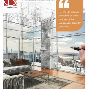 "G Line İnşaat Mimarlık Mühendislik ve Havacılık Sanayi Limited Şirketi, inşaat sektöründe edindiği bilgi birikimi ve tecrübeyi, güçlü mühendislik altyapısı ve yaratıcı mimari yaklaşımlarla birleştirerek hizmet sunan çok disiplinli bir firmadır. Anahtar teslim projelerde; inşaat, mimarlık, mühendislik, kentsel dönüşüm, havuz yapımı, izolasyon çözümleri gibi birçok alanda güvenilir ve kaliteli hizmet anlayışımızla fark yaratıyoruz."