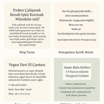 Markanı anlatan doğru cümleleri bulmak için buradayım. Sosyal medya, blog, web sitesi gibi alanlara özel, sade ve etkileyici içerikler hazırlıyorum. Yazım kurallarına uygun, zamanında teslim ve revizeye açık çalışırım. Detaylar için iletişime geçebilirsiniz.