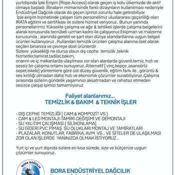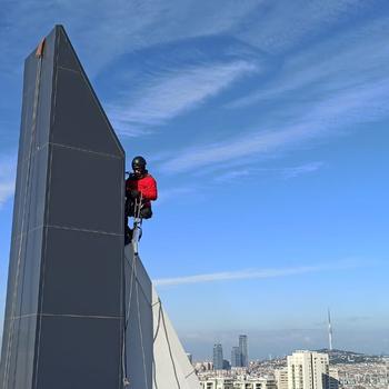 Günümüzde binaların yükselmesi ve cam kaplamaların çoğalması ile yurtdışında iple Erişim (Rope Access] olarak geçen iş kolu ülkemizde de aktif olmaya başladı .Binaların mimarisinde farklı dizaynların kullanılması nedeniyle Endüstriyel Dağcılık olarak da geçen işimizi zorunlu hale getirebiliyor. İple erişim hizmetinde çalışan tüm personelimiz uluslararası geçerliliği olan IRATA eğitimi ve sertifikası ile sizlere hizmet veriyoruz. Bunun yanında personellerimiz Yüksekte çalışma ve ağır & tehlikeli işlerde çalışma belgelerini alarak konusunda tecrübeli uzman kadro ile çalışıyoruz. Ekipman ve malzeme konusunda ; alanında gerekli ve şart olan dünya standartlarına uygun belgeli ürünleri kullanıyoruz .Kullanılan temizlik ürünleri çalışma alanına özel olarak seçilen binanıza ve çevreye dost ürünlerdir . Sizlere yüksekliği ne olursa olsun dış cephe temizlik ,teknik hizmetler,tamirat,tadilat,bakım, onarım ve iç mekanlarda ulaşılması zor olan alanlarda güvenli,temiz, hızlı ve sessiz bir çalışma ortamı sunuyoruz. Alternatif ( vinç, kepçe ,asansörlü sepet, iskele] yöntem[ere göre üst düzey güvenlik, eğitim farkı ile , görüntü & ses kirliliği olmadan daha hızlı ve ekonomik çözümler sunabiliyoruz. Çalışma sırasında sizlerin gündelik yaşamınızı aksatmadan ve rahatsız etmeden sesizce çalışıp işimizi tamamlıyoruz. -DIŞ CEPHE TEMİZLlĞi (CAM & KOMPOZİT VS ] - CAM & LED MONTAJI-TAMIRİ-DEĞIŞİMIVE DEMONTAJI - SU YALITIM ÇALIŞMASI ( SİLIKONLAMA] - SU GIDERI PVC PIMAŞ SU OLUKLARI MONTAJ VETAMIRATLARI - PLAZALAR, KONUTLAR, FABRIKA, AVM VS . VE SITELER DE ULAŞILMASI ZOR OLAN IŞLERDE YANINIZDA OLMAK ISTİYORUZ.