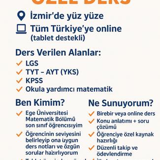 Merhaba, ben Ege Üniversitesi Matematik Bölümü son sınıf öğrencisiyim. Matematikte başarı için ezberden çok mantığını kavramak gerekir. Bu yüzden derslerimi öğrencinin seviyesini belirleyerek planlıyor, ona uygun ders notları ve özgün sorular hazırlıyorum.