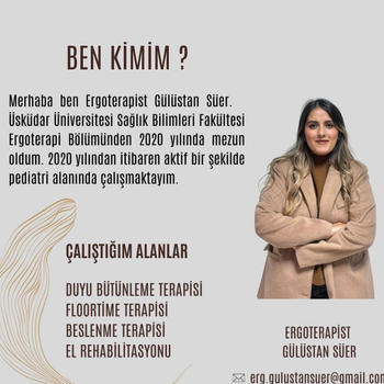 Merhaba Ben; Ergoterapist Gülüstan SÜER 6 yıldır pediatri alanında aktif olarak çalışan bir ergoterapistim. Floortime 201 terapisti ve beslenme terapistiyim. Çocuklarla daha etkili ve bütüncül bir şekilde ilerleyebilmek için mesleki gelişimime önem veriyor, eğitim ve sertifika programlarına düzenli olarak katılmaya devam ediyorum. Amacım, her çocuğun potansiyeline ulaşmasına destek olmak ve mesleki donanımımı sürekli güncel tutarak onlara en doğru yaklaşımla eşlik edebilmektir.