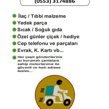 ACİL MOTORLU KURYE HİZMETİ - İlaç / Tıbbi malzeme - Yedek Parça - Sıcak / Soğuk gıda - Özel günler çiçek / hediye * Yasa dışı ve sağlığa zararlı maddeler, ahlaka aykırı yayınlar vb kapsam dışıdır.