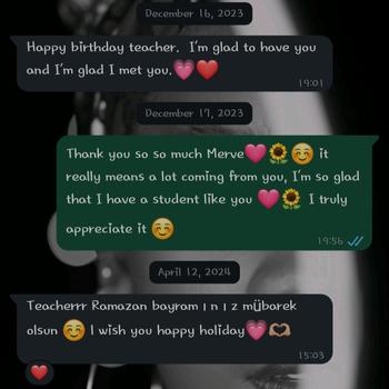 Hello! I'm Halima but you can call me Hailey :) I'm a passionate English teacher with 7 years of experience helping students of all ages learn in a fun and exciting way. I use creative methods to make English easy to understand and enjoyable. Many of my students have improved their speaking, grammar, and confidence quickly. If you’re looking for someone patient, energetic, and professional—I’d love to help. Your satisfaction is guaranteed! Merhaba! Ben Halima ama Hailey diyebilirsiniz :) 7 yıllık deneyime sahip, enerjik ve sabırlı bir İngilizce öğretmeniyim. Tüm yaşları ders verebiliyorum. Derslerimi eğlenceli, etkili ve öğrencinin seviyesine uygun şekilde planlıyorum. Öğrencilerimin çoğu kısa sürede konuşma, gramer ve özgüven konusunda büyük gelişme gösterdi. Siz de kaliteli ve keyifli bir eğitim arıyorsanız, doğru yerdesiniz. Memnuniyetiniz garanti!