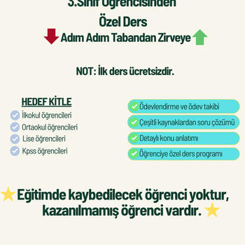 Uşak üniversitesi üçüncü sınıf öğrencisiyim. Bölümümün birincisiyim. Derslerim öğrencinin durumuna ve isteğine göre kendi evinde, öğretmenin evinde veya online olabilir. İlk dersim tanışma, seviye belirlemeye yönelik olduğundan ücretsizdir. Her öğrenciye seviyesine uygun ders planı, programı hazırlıyorum. Tüm derslerim meb kitaplarına bağlı kalınarak müfredat dahilindedir. Ne eksik ne fazla. En ince ayrıntısına kadar eksik kalmayacak şekilde konu anlatımından sonra çeşitli kaynaklardan sorular çözüyorum. En sonda ise öğrencinin kendini geliştirmesi açısından ödevlendirmeler yapıyor titizlikle kontrol ediyorum.