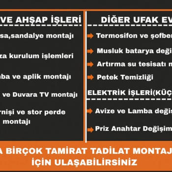 Boya , badana, su tesisati , dusakabin montaji ve tadilati , isi yalitim , su izolasyonu , siva , alci , elektrik isleriniz itina ile yapilir.