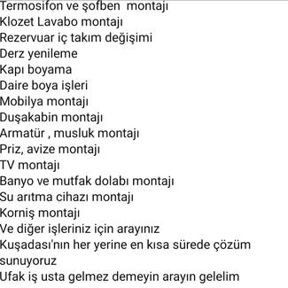 Boya , badana, su tesisati , dusakabin montaji ve tadilati , isi yalitim , su izolasyonu , siva , alci , elektrik isleriniz itina ile yapilir.