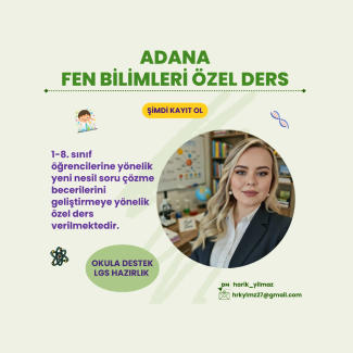 Fen Bilimleri dersleri, yapılandırmacı yaklaşımla öğrencinin ön bilgisine dayalı olarak bireyselleştirilmektedir. Konular anlaşılır anlatım, görsel materyaller ve günlük yaşam örnekleriyle sunulmakta; yeni nesil LGS soruları üzerinden analitik düşünme ve problem çözme becerileri geliştirilmektedir. Ortaokul düzeyinde okul desteği, yazılı hazırlık ve sınav stratejileri uygulanır. Eğitim online veya yüz yüze sürdürülür. İlk oturum, seviye tespiti amacıyla genellikle ücretsizdir. Kalıcı öğrenme ve fen okuryazarlığı hedeflenir.