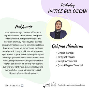 Merhaba, Ben Hatice Gül Özcan. Odtü Psikoloji mezunuyum. Online Psikolojik Danışmanlık Hizmeti veriyorum. Bilişsel Davranışçı Terapi ve BDT'nin bir uzantısı olan Şema Terapi ekolleri ile çalışıyorum.