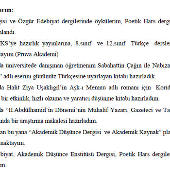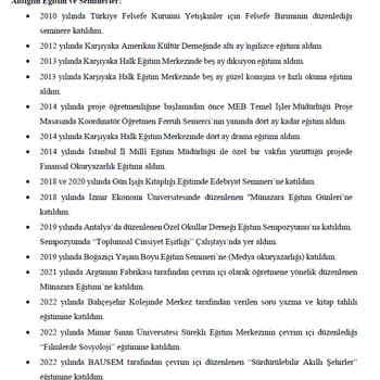 2017 Eylül ayında Özel Ege Lisesinde öğretmenliğe başladım. 2022 yılının Ağustos ayında kendi isteğimle kurumdan ayrıldım. Ağırlıklı 11 v e 12. sınıflarla çalıştım. Son üç yıldır sadece 12. sınıflarda derse girdim. Bununla beraber her grubun müfredat bilgisine hâkimim. Kurumdaki ilk iki yılımda 9, 10, 11, 12 ve TM sınıflarında ders girdim. Kendimi sınav gruplarında deneyimli görsem de tercihim bu gruplar olsa da lise kademesinde her branşta derse girebilirim. Kurumun deneme sınavlarını titizlikle hazırladım, soruları herhangi bir yerden almıyor hem anlam hem dil bilgisi sorularını titizlikle kendim yazıyorum. Bahçeşehir Koleji 50.Yıl Kampüsü Çiçekliköy’de eylül ayında başladığım görevimi hâlen sürdürmekteyim. 11, 11 (TM), 12 ve 12 (TM) sınıflarında derse girmekteyim. ürk Dili ve Edebiyatı branşında hem TYT hem AYT alanında öğrencileri YKS’ye hazırlama konusunda kendime güveniyorum. Ayrıca 8 ve 12.sınıf düzeyinde soru bankalarına sorular hazırlamaktayım. Yaklaşık 13 yıldır 7, 8, 9, 10, 11 ve 12. sınıflara özel ders vermekteyim.