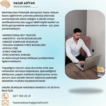 Merhaba ben psikolojik danışman Hazar adiyan psikoloji eğitimimin yanında çeşitli sertifikalarımla online terapi vermekteyim. Depresyonda BDT tedavisi BDT YETİŞKİN TERAPİSİ Inst: @senin_psikolojin