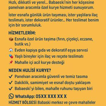 Panelvan aracımla Babaeski merkez ve çevre mahallelere özel kurye hizmeti sunuyorum. İster esnafa günlük ürün taşıması, ister yaşlılara ilaç teslimatı, ister evden kapıya eşya servisi… Her teslimatı dikkatle ve zamanında gerçekleştiriyorum.