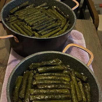 Evde yaprak sarma yapılır zeytinyağlı için yaprak kendi Manisa yaprağı zeytinyağı Gemlik kendi bahçemizin yağı. Ayrıca günler için Tava Lokumu, Çibörek, kısır yapılır.
