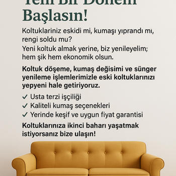 Koltuklarınızı yenileyelim, yepyeni olsun Koltuklarınız eskidiyse, kumaşı yıprandıysa ya da rengi solduysa yeni almak yerine uygun fiyata yenileyelim Kumaş değişimi Sünger yenileme Usta işçilik Yerinde keşif ve fiyatlandırma