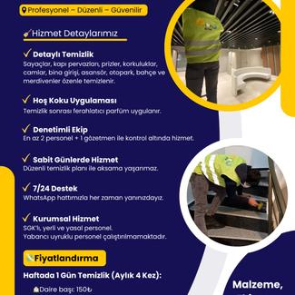 Apartman ve Site Temizliği Hizmet Detaylarımız - Titiz Temizlik: Su sayaçları, doğalgaz sayaçları, kapı pervazları, prizler, merdiven korkulukları, ortak alan camları, bina giriş kapısı, asansör içi ve kat kapıları detaylı şekilde temizlenmektedir. Ayrıca açık otopark, bahçe ve merdiven alanları özenle temizlenir. - Kurumsal Hizmet: Firmamız kurumsal kimliğe sahip, profesyonel bir temizlik şirketidir. - Sigortalı ve Yasal Personel: Apartmanınıza gelen tüm personelimiz SGK güvenceli ve yerli çalışanlardan oluşmaktadır. Yabancı uyruklu personel çalıştırılmamaktadır. - Tüm Malzeme ve Ekipmanlar Bizden: Temizlikte kullanılacak tüm malzeme ve ekipmanlar firmamız tarafından temin edilir. - Su Kullanımı Firmamıza Aittir: Temizlik sırasında kullanılacak su firmamız tarafından sağlanmaktadır. - Açık Otopark Temizliği: Açık otoparkınız düzenli olarak temizlenmekte ve temiz tutulmaktadır. - Bahçe Temizliği: Bahçeniz her temizlikte kontrol edilmekte ve özenle temizlenmektedir. - Hoş Koku Uygulaması: Temizlik sonrasında merdiven boşluklarına ferahlatıcı ve kalıcı parfüm uygulanarak hoş bir koku bırakılır. - Sabit Temizlik Günleri: Temizlik hizmetimiz, belirlenen sabit günlerde düzenli olarak sağlanmaktadır. - Denetimli Ekip: Temizlik ekibimiz en az 2 kişiden oluşur ve bir gözetmen eşlik eder. Gözetmen, temizlik kalitesini denetler ve taleplerinizi çözüme kavuşturur. - 7/24 İletişim Desteği: Memnuniyetiniz için 7 gün 24 saat açık WhatsApp hattımız ve tecrübeli personelimizle her zaman çözüm odaklıyız.