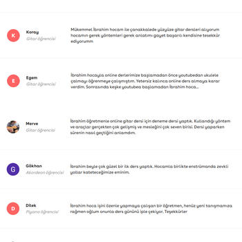 Merhaba ben Uzman Müzik Öğretmeni İbrahim Güler. Her yaş grubuyla, öğrencilerimin hedefleri doğrultusunda derslerimi sürdürmekteyim. Öğrencilerime müzik teorisi ile ilgili gerekli teorik bilgileri kazandırarak, çalgı öğrenme mantığını öğretip, çalgıyı notayla ve akademik olarak öğrenmesini sağlamaktayım. Online çalgı eğitim konusunda oldukça tecrübeliyim ve farklı yaş gruplarında bir çok öğrenci geliştirdim. Müzik eğitiminde en önemli nokta öğrencinin sabırlı, devamlı ve uygulamayı yeterince yapmasıdır. Bu temeller üzerine başlayıp ilerleme kaydetmeyen bir öğrencim olmadı. Derslerimle ilgili öğrenci ve veli yorumlarını, ders değerlendirmelerimi okumak için aşağıdaki fotoğrafları inceleyebilirsiniz. Ayrıca uygulama üzerinden gelen öğrencilere ilk tanışma dersini ücretsiz yapmaktayım.