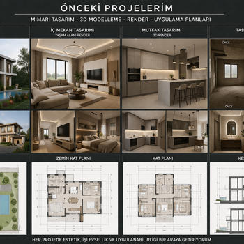 Merhaba, ben Mimar İrem. İhtiyacınız olan projeyi hızlı, estetik ve uygulanabilir şekilde hazırlıyorum. Özellikle 3D render ve iç mekan tasarımında karar vermenizi kolaylaştıran gerçekçi görseller sunuyorum. Hizmetlerim 2D plan çizimi 3D modelleme ve render İç mekan tasarımı Villa ve konut projeleri Tadilat projeleri Ucretsiz on gorusme sagliyorum Hizli teslim yapiyorum Revize destegi sunuyorum Surec boyunca iletisime acigim Amacim sadece cizim yapmak degil size uygun ve uygulanabilir bir sonuc ortaya cikarmak Projenizle ilgili detaylari konusmak icin mesaj atabilirsiniz