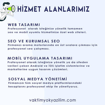 Vaktim Yok Yazılım olarak 2012 yılında Buca'da küçük bir ofiste sevdiğimiz işi yapmaya başladık. Amacımız her zaman öncelikle işlevsellik ve en uygun çözümlerle her ölçekte firmaya uygun çözümler sunmak, ihtiyaçlarını en işlevsel ve en uygun fiyata üretmek olan bu yolculuğumuzda bugün 200'den fazla firmaya çözümlerimiz ile işlerini kolaylaştıran ve yüzlerce internet sitesi ile mutlu müşterileri olan bir noktadayız.