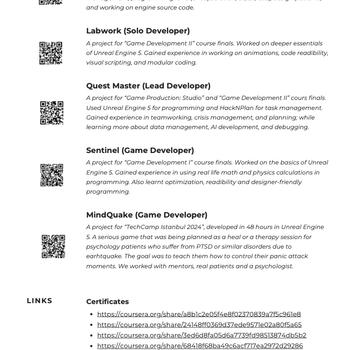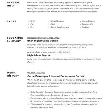 Merhabalar, ben Kaan. Bahçeşehir Üniversitesi Dijital Oyun Tasarıım 4. Sınıf öğrencisiyim. Unity, ve Unreal Engine oyun motorlarını kullanarak, C# ve C++ dilinde yazılımlar yapıp geliştirdiğim çeşitli projelerim mevcut. Ayrıca birçok projemde de tasarım alanlarına katkıda bulundum. İletişim halinde kalarak beraber dilediğiniz oyunları geliştirebilir, kod hatalarını düzeltmeye yardımcı olabilir, veya dilediğiniz sistemlerin/mekaniklerin kodlanmasını sağlayabilirim. Detaylar için CV'me göz atabilirsiniz; soru veya teklifleriniz için iletişime açığım.
