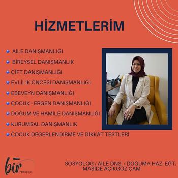 Maşide Açıkgöz Çam Sosyolog / Aile Danışmanı / Doğuma Hazırlık Eğitmeni Lisans eğitimimi Erciyes Üniversitesi Sosyoloji bölümünde tamamladım. Mezuniyetimin ardından; Aile Danışmanlığı, Hamile ve Doğum Danışmanlığı, Çocuk değerlendirme ve dikkat testleri uygulayıcı eğitimi aldım. Kişisel ve mesleki gelişimim ile ilgili birçok eğitime, vaka analizlerine ve seminerlere katıldım Şu anda Kayseri Bir Psikoloji Merkezinin kurucusuyum ve danışanlarım ile seanslarıma devam etmekteyim. Danışmanlık yolcuğumda eğitimlerime yenilerini eklemeye devam etmekteyim. Özellikle Çiftler ile çok fazla çalışma fırsatım olmakla birlikte; ebeveyn- çocuk ilişkisi, çocuk atölyeleri, çift atölyeleri, kişiler arası ilişkiler, çift ilişkileri, çiftlerde aldatma, çiftlerde iletişim problemleri, öfke yönetimi, çiftlerde aşk-sevgi kaybı, orta yaş problemleri, kıskançlık, üçüncü kişilerin dahil olduğu problemler, ebeveyn problemleri, boşanma süreçleri, doğum çalışmaları, evlilik öncesi süreçlerde çalışma ve seminerler verme fırsatım oldu. Çalışma Alanları: - Aile ve Çift Danışmanlığı - Bireysel Danışmanlık - Doğuma ve Hamile Danışmanlığı - Ebeveyn Danışmanlığı - Ergen Danışmanlığı - Çocuk Değerlendirme ve Dikkat Testleri - Kurumsal Danışmanlık