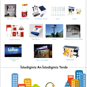 Tüm tabela çesitleri billboard branda cam giydirme katalog dergi flama ve promosyon ürünleri gibi geniş bir hizmet yelpazesi sunarak, müşterilerimizin ihtiyaçlarına özel çözümler geliştirmekteyiz.