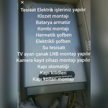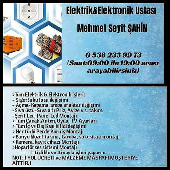Elektrik elektronik ustayım Elektrik işleriniz Şu tesisatı TV askı aparatı montajı Çanak anten LNB montajı Musluk batarya montajı Şu arıtma montajı Priz hat çekme Ses sistemi montajı Kamera kayıt cihazı montajı Şohben kombi montajı